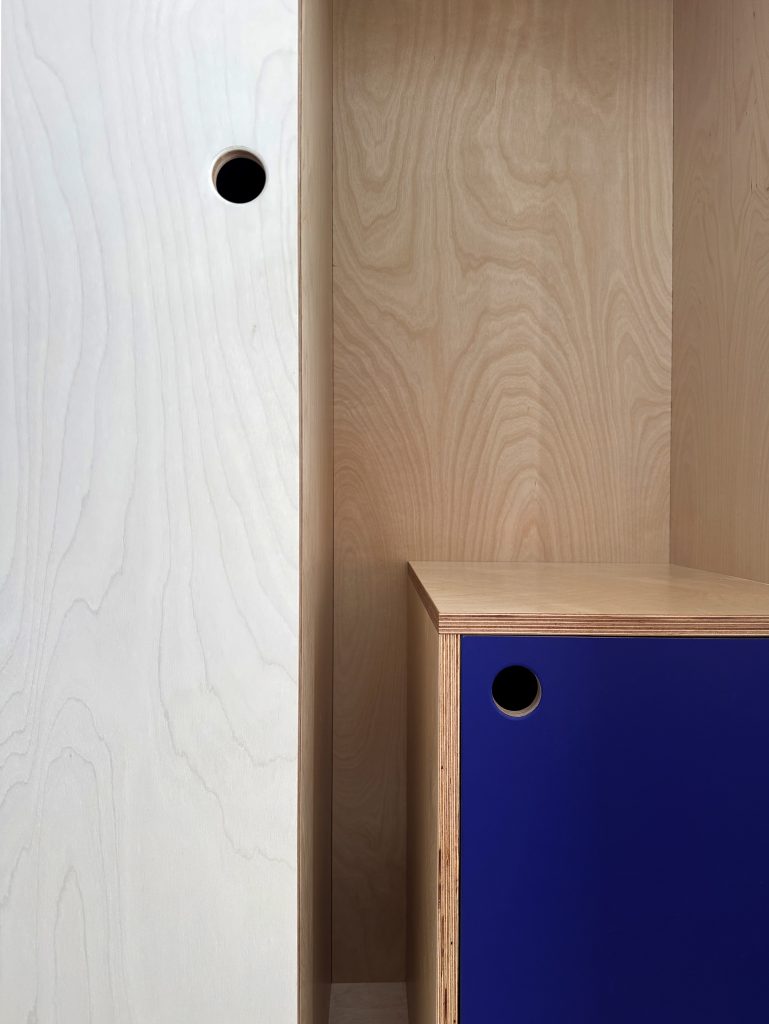 Les portes principales sont habillées d’une teinte et finition Rubio, tandis que l’intérieur révèle sur les façades un bleu Outremer de chez Ressource