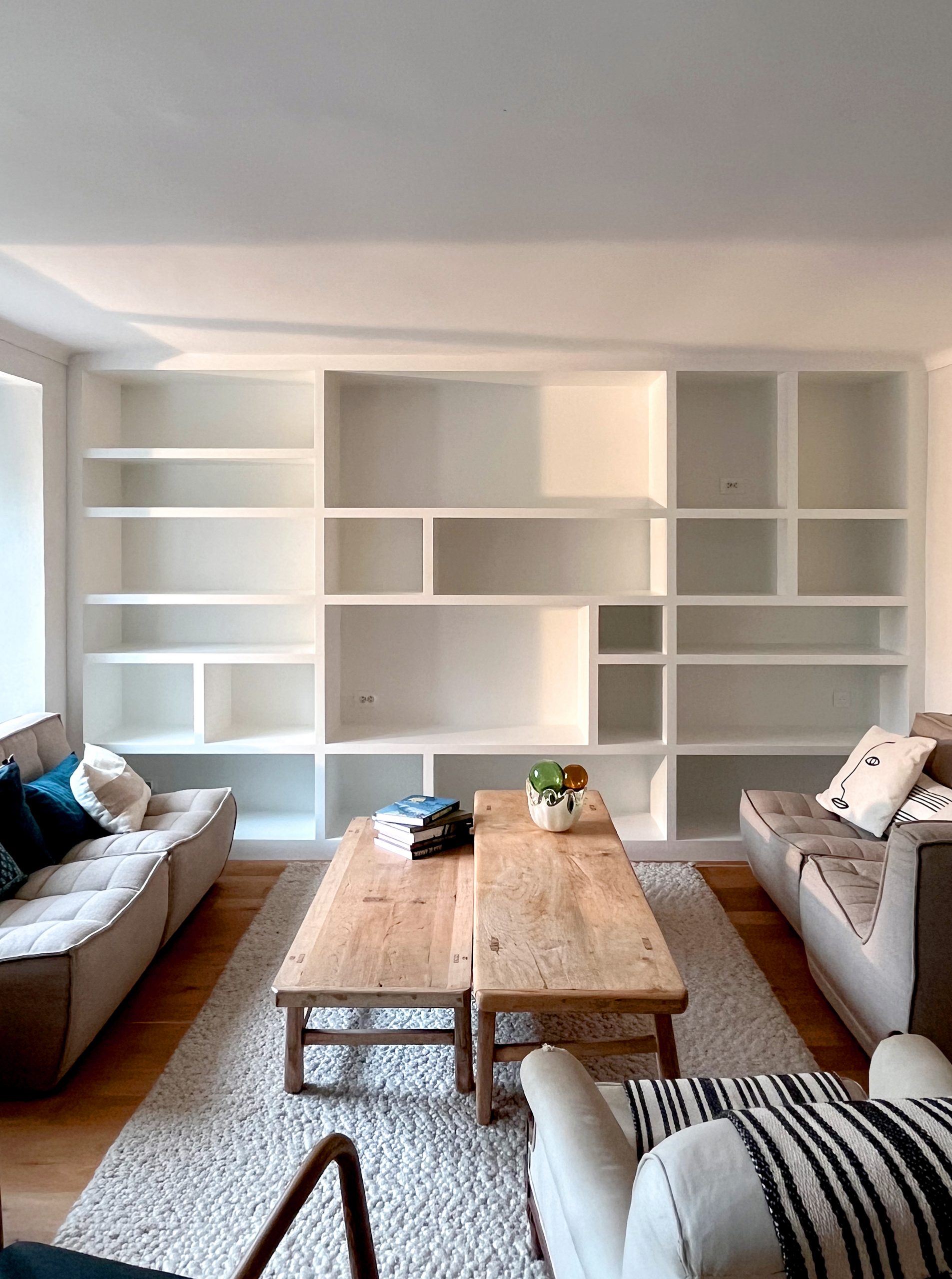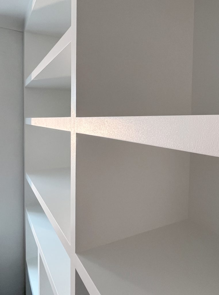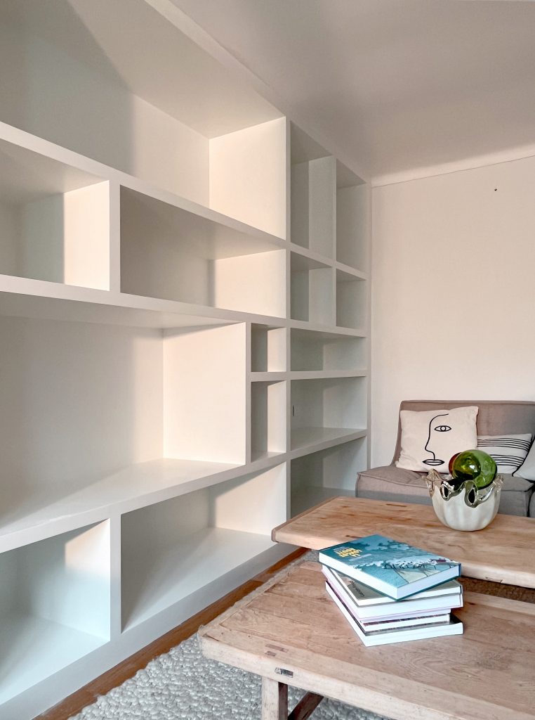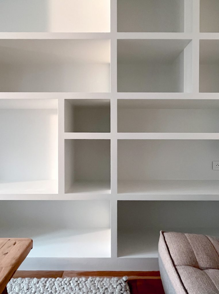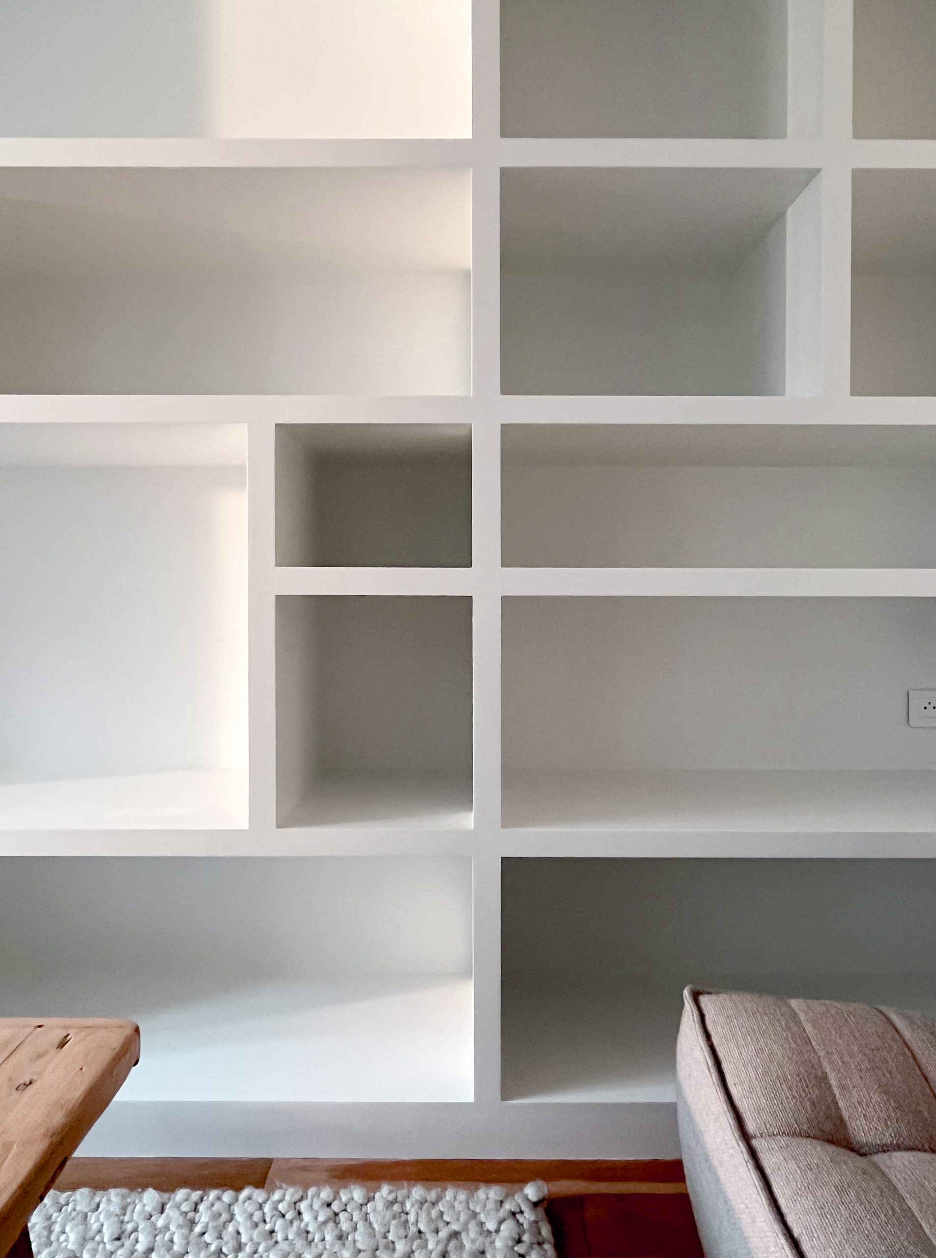 Réalisée sur mesure et peinte entièrement en blanc, elle donne l’impression d’être sculptée directement dans la pièce.