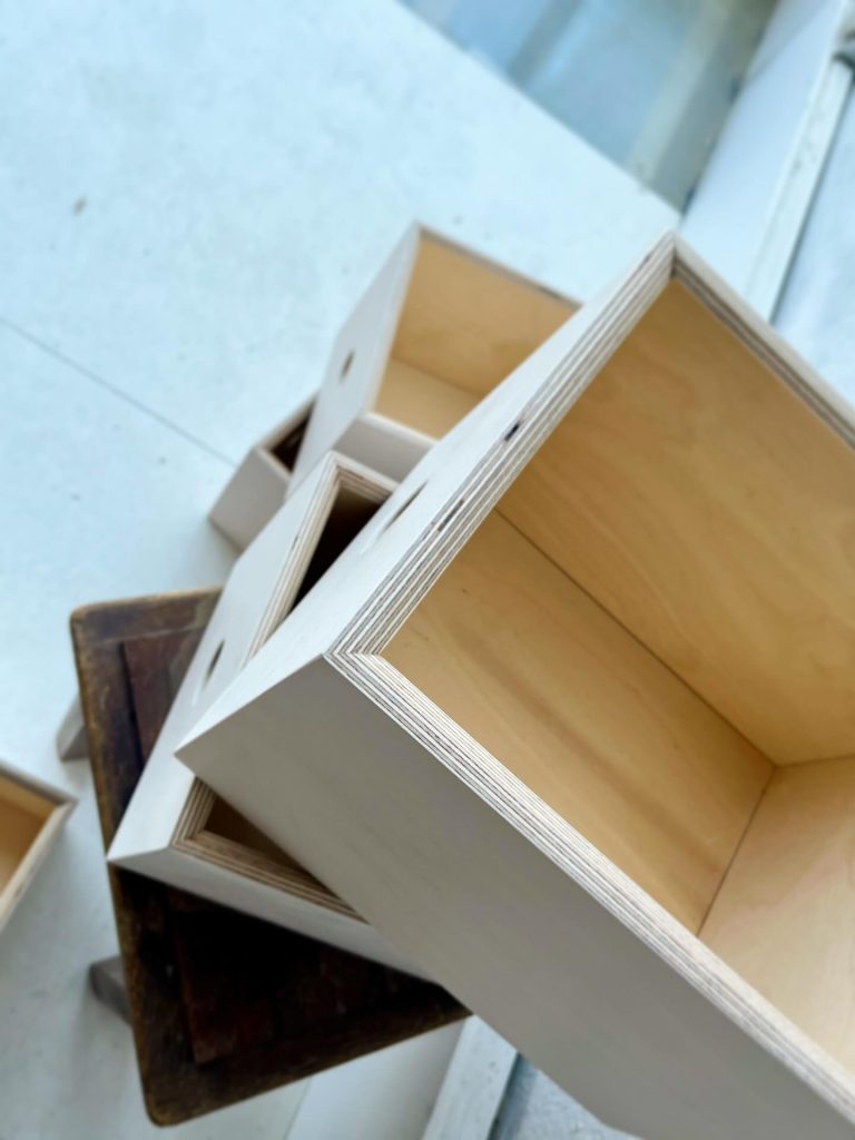 En contreplaqué bouleau, teinté et finition blanche Rubio