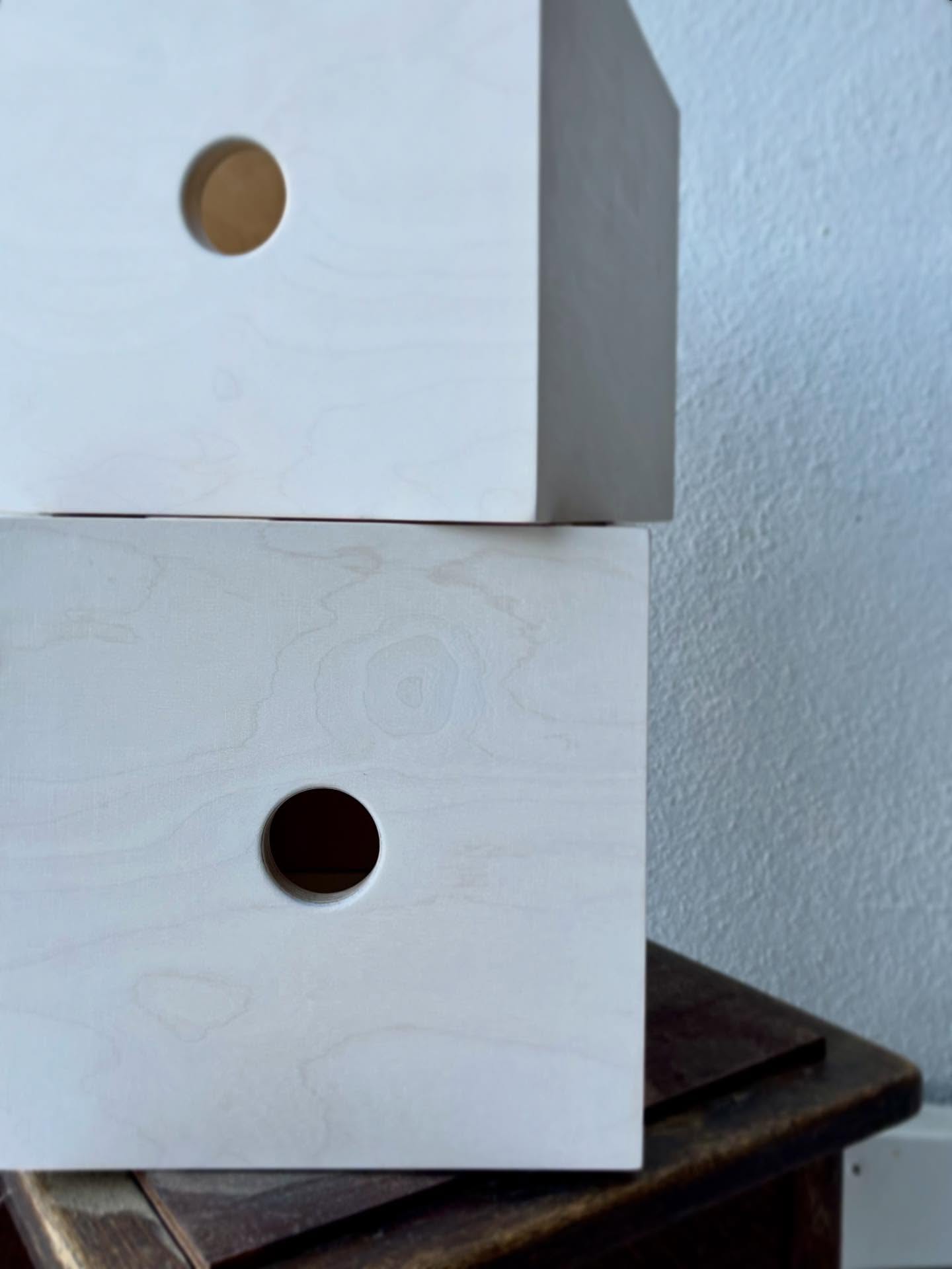 En contreplaqué bouleau, teinté et finition blanche Rubio