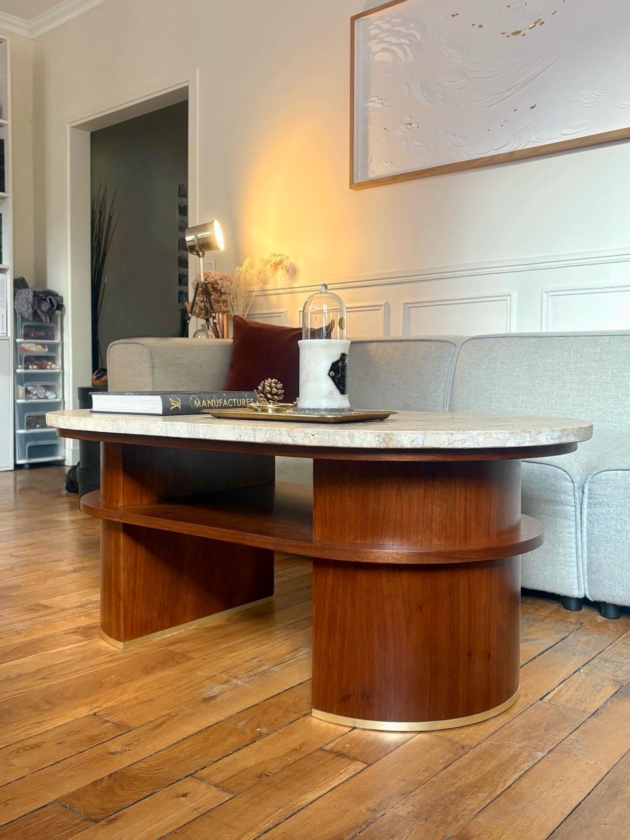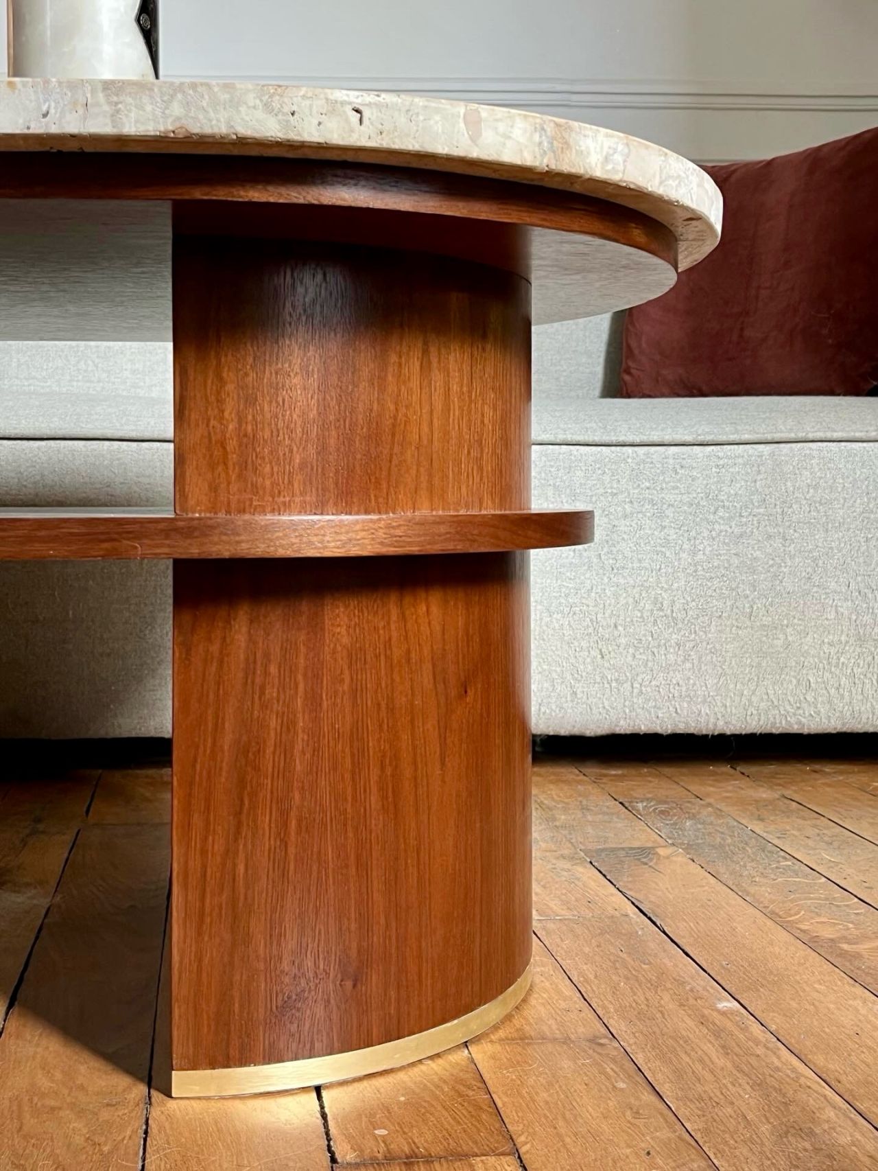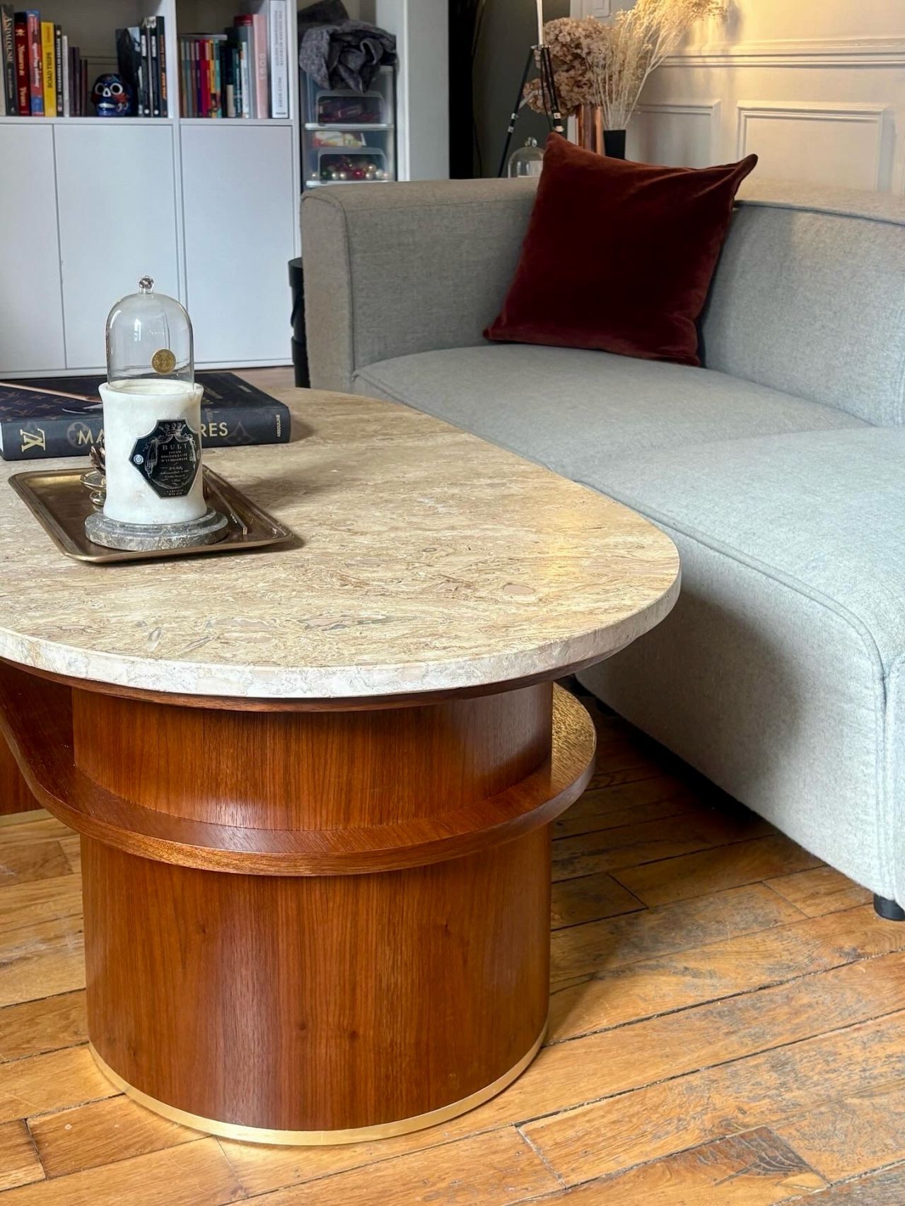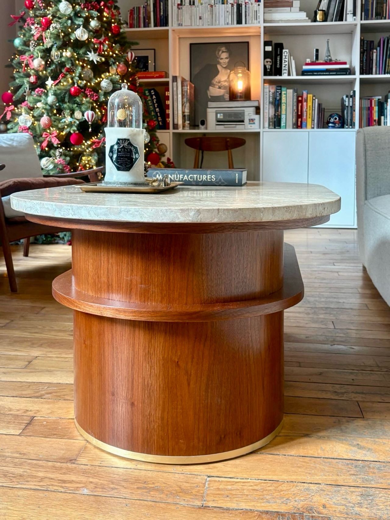 Son plateau en marbre existant trouve une nouvelle assise, posé sur un piètement dessiné et façonné sur mesure.