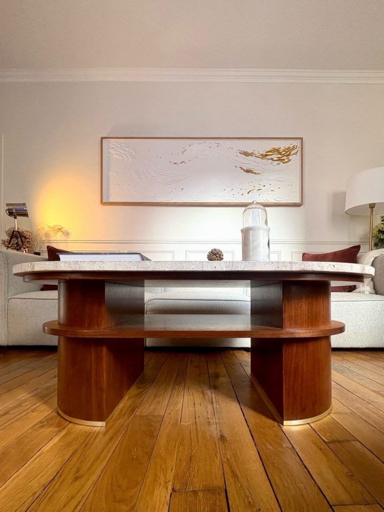 Le dessin du piètement prolonge l’arrondi de la pierre pour accompagner naturellement ses courbes.